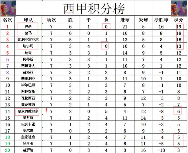 积分榜方面,本轮全部战罢,皇马惨败终止6连胜后,新赛季没有全胜球队,巴萨1分优势反超皇马登顶,皇马领先比利亚雷亚尔2分跌到第2。巴萨之外只有升班马埃尔切还保持不败,他们差皇马5分排在第4。奥维耶多今天逆转绝杀瓦伦西亚止住3连败颓势,反超皇家社会,塞尔塔等队1分逃出降级区。