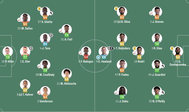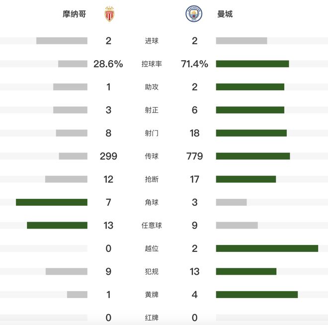 出场阵容曼城(4141):25-多纳鲁马;5-斯通斯(73’27-努内斯),3-迪亚斯,24-格瓦迪奥尔,33-奥莱利;16-罗德里(61’14-尼科);20-B席,4-赖因德斯,47-福登,11-多库(61’26-萨维尼奥);9-哈兰德摩纳哥(3421):16-科恩;5-科雷尔,3-戴尔,3-萨利苏;2-万德森,4-特泽,28-库里巴利,27-迪亚塔;11-阿克利乌舍,31-法蒂;9-巴拉贡