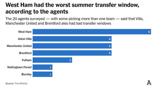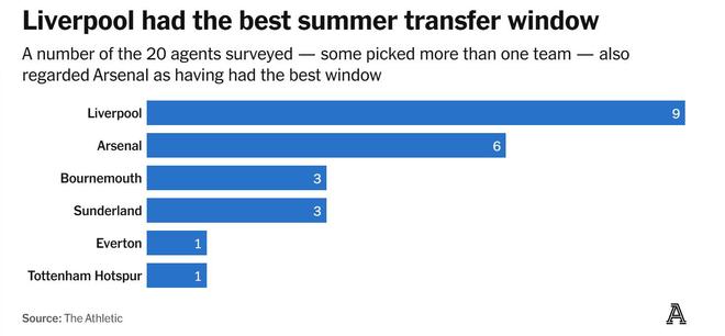 实际上,这位经纪人谈论的是阿森纳,他们在苏比门迪、埃泽、哲凯赖什、内尔高、马杜埃凯、克里斯蒂安-莫斯克拉、因卡皮耶和凯帕身上花费了2亿多英镑,是今夏支出第三高的球队。如果把销售额也考虑进去,阿森纳的净支出是最大的。“他们审视了阵容中存在的问题并解决了它们,”一位经纪人解释说。“哲凯赖什本赛季将在英超打进 20 球,这是他们多年来所需要的,而苏比门迪是欧洲最好的中场之一。即使是因卡皮耶,他们以租借形式签下作为替补,也能在大多数英超球队中踢上主力。如果再加上埃泽,他们现在拥有联赛中最好的阵容。”阿森纳实际上以六票位居第二。利物浦花费4.18亿英镑的采购狂潮(通过价值1.9亿英镑的球员销售抵消)为他们赢得了赞誉和榜首位置,尽管几位新援尚未产生化学反应。“我认为如果利物浦在截止日签下了格伊,那可能将是任何人有史以来最好的转会窗口了,”一位经纪人说。看看利物浦目前的防守,有理由认为水晶宫的英格兰中卫格伊本可能是所有签约中最重要的。除了阿森纳和利物浦,桑德兰和伯恩茅斯也得到了大量支持,后者在出售了超过2亿英镑的球员后实现了8500万英镑的利润,但目前却在英超排名第四。“他们从巴黎圣日耳曼、皇家马德里和利物浦身上榨取的价值是惊人的,”一位经纪人说。“是的,利物浦有一个不可思议的窗口,但他们花了很多钱才得到那些球员,”另一位经纪人说。“利物浦卖得很好,但他们出售的是已经效力一段时间了的球星。伯恩茅斯出售的球员中,有些只待了一年,就以对于他们这种规模的俱乐部来说天文数字的价格转手了。而且我认为他们也招募得很好。所以,按性价比来说,我会说伯恩茅斯拥有最好的窗口。”桑德兰在升级后的大胆做法赢得了赞赏者的青睐。“我们现在处于这样一个时代,升班马会直接降级,”一位经纪人说。“我认为作为所有权集团,作为体育总监,你可以相当接受这一点,如果这是一个长期建设过程的话:升级,降级,再用你的降落伞资金升级,然后成为一支可持续的英超球队。”“但我认为桑德兰花费 1.6 亿英镑,引进像扎卡、穆杰莱和哈比卜-迪亚拉这样的球员,真的非常勇敢,而且并不愚蠢。我认为其中很多球员都是长期签约。”哪家俱乐部拥有最差的转会窗口?西汉姆联——本赛季关于他们的这种说法并不多——在这方面“获胜”了。