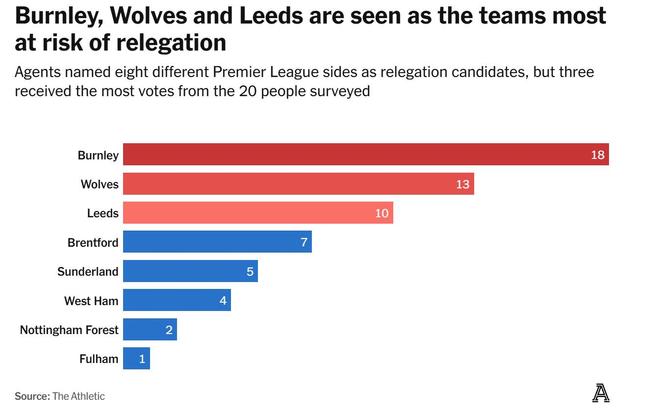 只有两位经纪人预测所有三支升班马将连续第三个赛季降级,这很大程度上说明了基于桑德兰令人印象深刻的转会窗口和他们的赛季开局,外界对他们的乐观看法。这也反映出狼队的负面情况,他们获得了第二高的降级票数(13票),仅次于伯恩利(18票)。“狼队现在太软弱了,而且他们失去了关键球员,”一位经纪人说。“那是一支会挣扎求存的阵容。”根据接受调查的经纪人的看法,布伦特福德被认为比桑德兰更有可能降级,而西汉姆联、诺丁汉森林和富勒姆也被列为潜在的降级候选。“狼队、西汉姆联和布伦特福德目前都处于大麻烦中,但他们原有(阵容)的实力与升班马球队原有的实力差距是巨大的,”一位经纪人说。“桑德兰、利兹联和伯恩利在夏季窗口尽他们所能进行了所有采购。我认为布伦特福德、西汉姆联和狼队都会在一月份大力引援以寻求保级。”【上咪咕独家看英超】