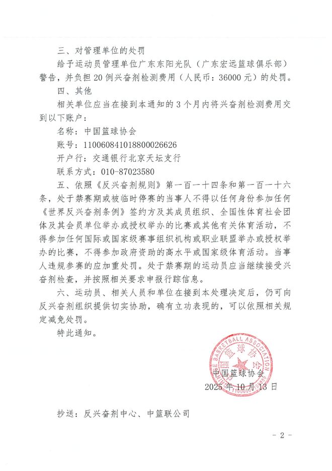 中国篮球协会根据国家体育总局《反兴奋剂规则》的有关规定,给予吉伦沃特禁赛3个月的处罚,禁赛期自2025年10月13日至2026年1月12日;对运动员管理单位广东东阳光队(广东宏远篮球俱乐部)警告,并负担20例兴奋剂检测费用(人民币:36000元)的处罚。采写:南都N视频记者 李晓艺
