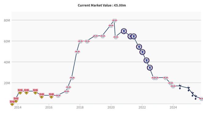 从斯图加特出道的维尔纳2014年时身价曾达到1200万欧元,在2016年夏天转会RB莱比锡之后,这位锋线球星的身价就一路上涨,2020年3月达到生涯峰值的8000万欧元。2020年夏天维尔纳转会到了切尔西,当时他的身价还曾经达到7000万欧元,但此后就一路下跌,2022年夏天他回到RB莱比锡之后身价仅剩2500万欧元,2024年冬窗加盟热刺之后他的身价进一步下跌至1700万欧元。