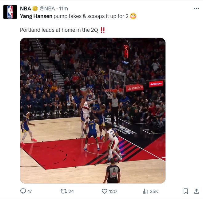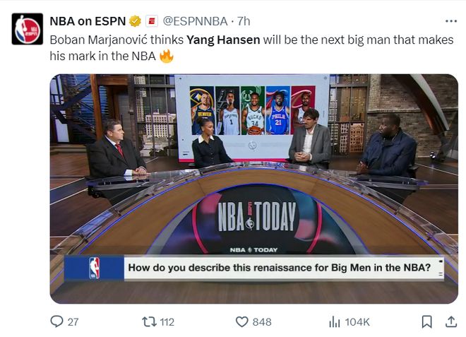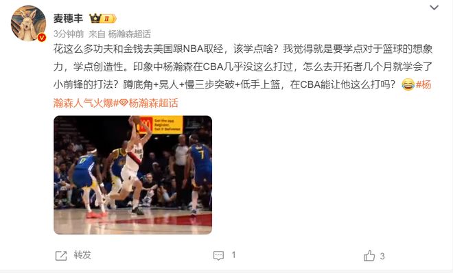 广东媒体人麦穗丰:印象中杨瀚森在CBA几乎没这么打过,去开拓者几个月就学会了小前锋打法,蹲底角+晃人+慢三步+低手上篮,在CBA会让他这么打吗?去NBA取经有效。
