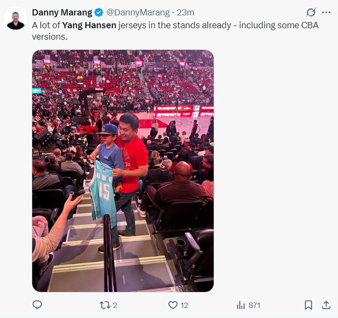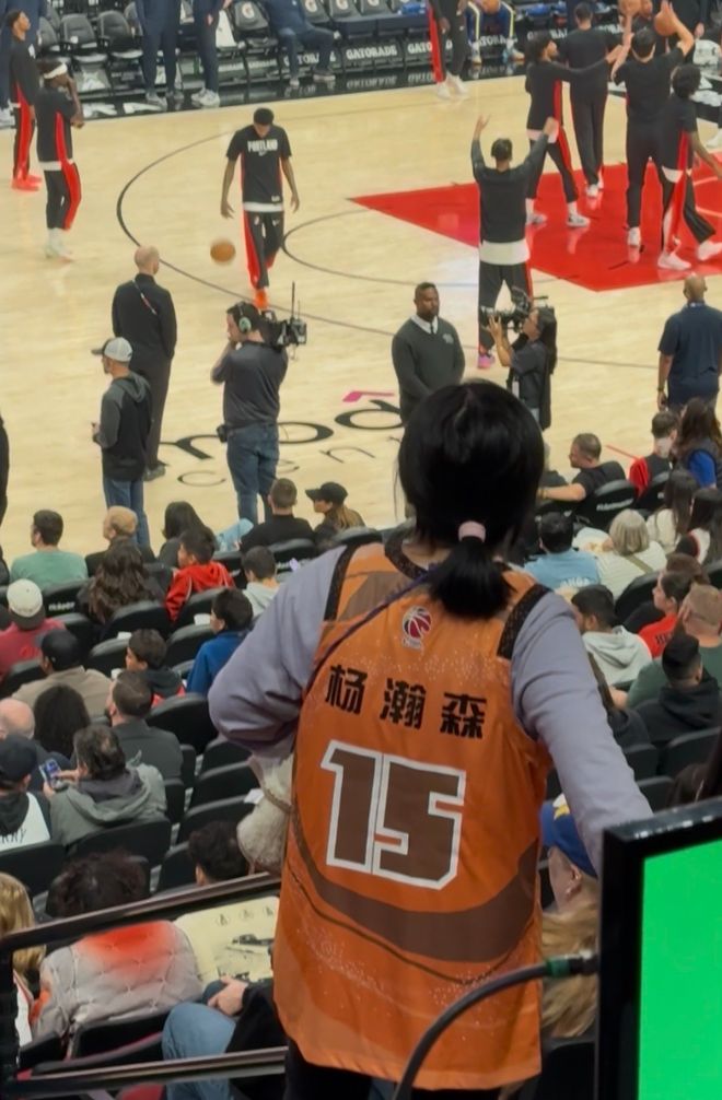开拓者记者还拍到一位中国球迷抱着自己的儿子手拿杨瀚森CBA青岛球衣来支持小杨。