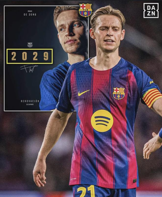 巴萨官方公告:“德容将长期身披巴萨战袍。今天,这位中场球员与巴塞罗那足球俱乐部签署了新合同,合同有效期至2029年。德容与俱乐部主席拉波尔塔共同出席了在俱乐部总部举行的签约仪式。”