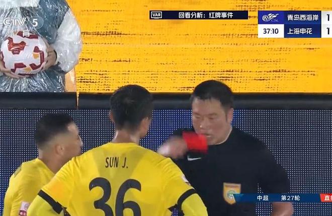 第37分钟,孙捷飞踹于汉超,裁判观看VAR后出示红牌,西海岸十人应战