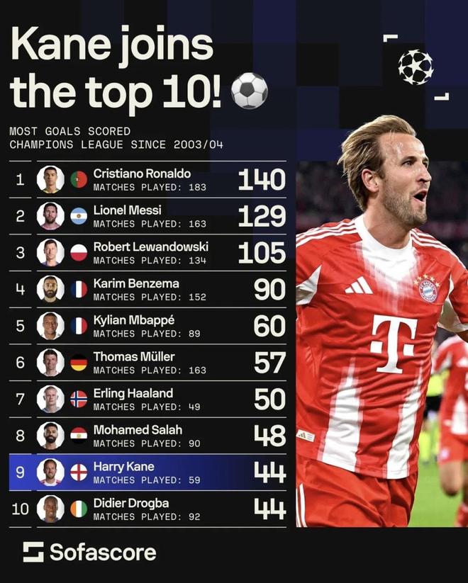 欧冠场均进球榜出炉!凯恩效率这么高若早点去拜仁效率更逆天