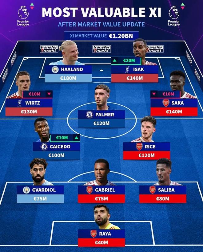 北京时间10月18日,在更新了英超球员的身价之后,德转统计出了此次更新后英超身价最高的11人阵容,哈兰德1.8亿欧元领衔,7人身价达到亿元级别。