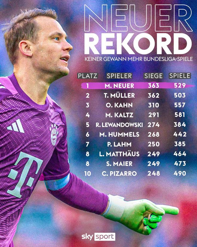529场363胜,诺伊尔超越穆勒成为德甲历史胜场最多的球员