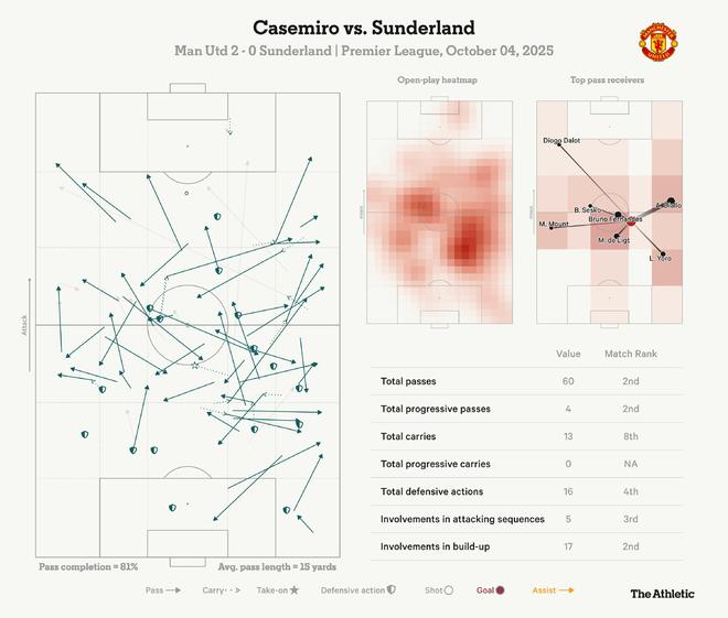 2024年夏训期间,卡塞米罗以更出色的身体状态回归曼联,并誓言要证明批评者是错误的。这也解释了为何本赛季初对阵利物浦的那场比赛,会让他如此受伤——半场被换下场的尴尬,加上社交媒体上的铺天盖地的指责,甚至让他的妻子安娜・玛丽安娜忍不住发声。她在社交平台上晒出丈夫的奖杯收藏,以此提醒外界卡塞米罗过往的辉煌成就。随后滕哈赫下课、阿莫林上任,但卡塞米罗的困境仍在继续。2024 年底,卡塞米罗与埃里克森在中场被纽卡斯尔彻底压制,当时外界普遍认为阿莫林会将他排除在长期计划之外。直到曼联中场遭遇伤病危机,且欧联杯赛事为他提供了机会,卡塞米罗才得以向阿莫林证明自己尚未 “过气”。2025年初,他提升了体能水平,在训练中表现得愈发敏锐。在曼联欧联杯淘汰赛的每一场比赛中,他均首发出场 —— 面对那些逼抢强度低于英超球队的对手,他的发挥十分出色。本赛季英超前7轮比赛,这位巴西中场已首发5次。卡塞米罗为曼联中场提供了不可或缺的平衡,有时甚至能让阿莫林那套备受争议的阵型正常运转。尽管外界对这套战术体系仍有质疑,但当卡塞米罗缺席时,其有效性会进一步打折扣。上个月对阵曼城时,乌加特竟取代卡塞米罗首发,这一决定当时便令人意外。那场比赛曼联在伊蒂哈德球场0-3惨败;而此前因在对阵切尔西时吃到第二张黄牌被停赛,卡塞米罗缺席了曼联1-3负于布伦特福德的比赛。尽管曼联在2024年以 5000 万英镑签下乌加特,但鉴于卡塞米罗在队内的顺位高于这位乌拉圭中场,且表现更胜一筹,若曼联想要摆脱卡塞米罗的高薪负担,恐怕仍需投入巨额资金引进新的替代者。回顾上赛季的数据分析(样本量更大),在曼联队内,仅有布鲁诺-费尔南德斯和利桑德罗-马丁内斯的场均触球次数多于卡塞米罗。而在 “传球进入进攻三区” 这项数据上,也只有如今与他搭档中场双核的费尔南德斯比他更多。对卡塞米罗而言,更重要的是他的场均抢断次数(4.5次)位列曼联全队第一,而球权恢复次数也仅少于费尔南德斯。国际比赛日前,曼联2-0击败桑德兰,这场胜利缓解了阿莫林的帅位压力。卡塞米罗在本场比赛中的表现(如下方球员数据面板所示),进一步凸显了他在球队中的重要性。