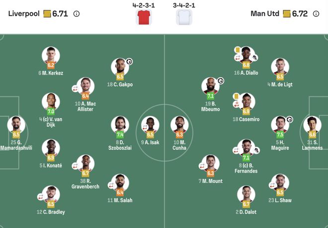 出场阵容利物浦(4231):25-马马达什维利;12-布拉德利(62’7-维尔茨),14-科纳特,4-范迪克,6-科尔克兹;38-赫拉芬贝赫(61’17-琼斯),10-麦卡利斯特(62’22-埃基蒂克);11-萨拉赫(85’30-弗林蓬),8-索博斯洛伊,18-加克波;9-伊萨克(72’14-基耶萨)曼联(3421):31-拉门斯;4-德里赫特,5-马奎尔,23-卢克肖(85’15-约罗);16-迪亚洛(58’13-多古),18-卡塞米罗(58’25-乌加特),8-B费(85’37-梅努0,2-达洛特;19-姆伯莫,10-库尼亚;7-芒特(61’30-谢什科)