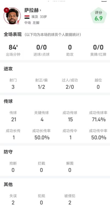 令人失望!萨拉赫全场3次射门仅1射正,传球成功率七成