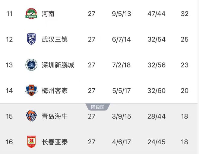 随着亚泰队0-2完败河南队,中超本赛季的降级热门球队基本上已经诞生,就是降级区积18分的海牛队和亚泰队。而本轮拿分的深圳新鹏城、武汉三镇队,基本上已经提前上岸,稍微比较悬的就是梅州客家队。他们距离降级区只有2分的优势。