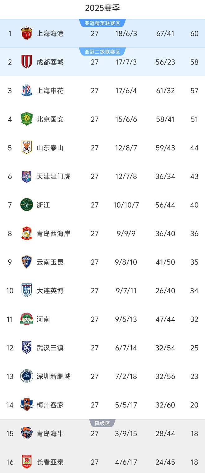 中超27轮积分榜:11队积分突破30分,仅剩3队争冠,降级4选2