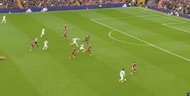 曼联在赢得第二落点方面表现出色,并迅速将其转化为进攻机会。迪亚洛吸引了凯尔凯兹的防守注意力,但他将球轻轻传给已经拉到边路的姆伯莫,后者迫使范戴克移动到比己方禁区还宽的位置。库尼亚随后插上进入空当,迫使门将马马尔达什维利做出扑救。第30分钟,随着姆伯莫向前推进,迪亚洛拉开边路。凯尔凯兹不得不跟随迪亚洛的跑动以防姆伯莫传球给他,这使得范戴克陷入一对一的不利局面。
