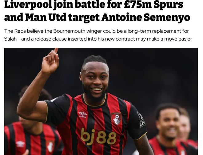本赛季的8场联赛,萨拉赫全部首发出战,但他的进球数却只有可怜的2个,其中有一球,还是通过点球的方式打进。如此低迷的表现,让利物浦的死忠球迷詹俊都忍不住感叹,萨拉赫是时候坐坐替补席,把机会让给更有欲望、冲击力的年轻人了。或许是听到了球迷的心声,根据英国媒体《inews》的爆料,利物浦高层已经物色好了萨拉赫的替身,他就是效力于伯恩茅斯的攻击手塞门约。最快在今年的冬季转会窗,红军就将出手,引进这位英超现在最炙手可热的边路攻击手。