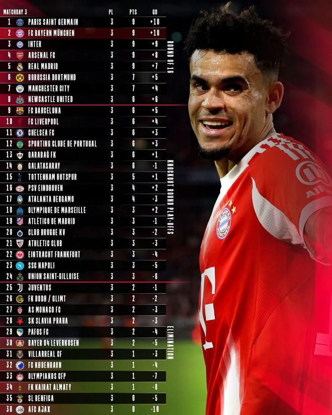 积分与净胜球均相同,拜仁晒欧冠积分榜预热下一轮对阵巴黎