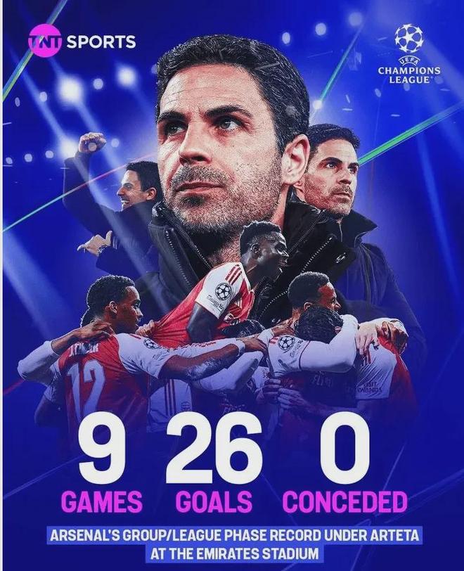 在阿尔特塔执教下,阿森纳在欧冠小组赛或者联赛阶段总共在酋长球场踢了9场比赛,战绩为:9战全胜!且进27球,丢0球,全部0封对手!真是越看越胆战心惊……阿尔特塔执教阿森纳以来,欧冠第一阶段(含小组赛)主场9场比赛,全部拿下说实话还能想象,但9场全部零封取胜,这难度也太大了……完全不给对方任何机会啊。就是皇马(虽然不是在第一阶段相遇)来了,也得起来敬三杯再走……如果说防守拿到冠军,那么确实该到拿冠军的时候了。