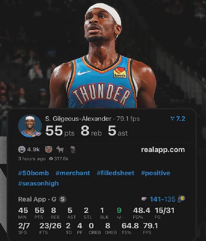 揭幕战,雷霆双加时125-124险胜火箭,亚历山大投篮26中12,罚球14中10,贡献35分5板5助;次战,雷霆双加时141-135击败步行者。亚历山大投篮31中15,罚球26中23,狂轰55分8板5助。两场比赛下来,亚历山大就成为了本赛季首个50+分先生,合砍90分之多。