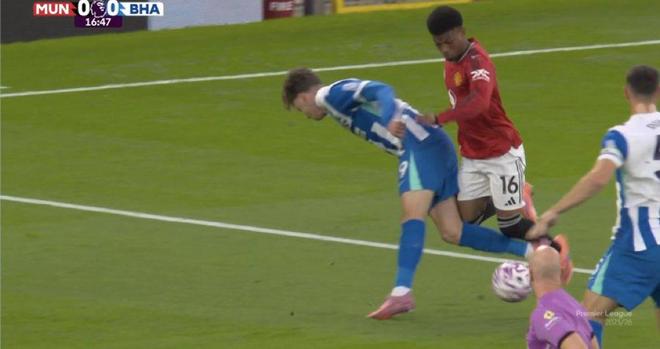 雷速体育10月26日讯 英超第9轮,曼联暂时2-0领先布莱顿。比赛第15分钟,阿马德突入禁区内被德库耶佩放倒,裁判并未做出判罚。英超官方对此给出了解释:主裁判未判给曼联点球的决定经VAR核查后确认——认定德库耶佩先触碰到球。