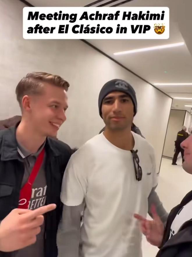 赛后,有球迷在伯纳乌VIP区域遇到了到场观战的阿什拉夫,并与其进行合影。阿什拉夫出道于皇马青训,2017年进入皇马一线队,并随队赢得了欧冠冠军、西班牙超级杯冠军、欧洲超级杯冠军以及世俱杯冠军。2020年9月,阿什拉夫转会加盟国际米兰。2021年7月,阿什拉夫加盟巴黎。