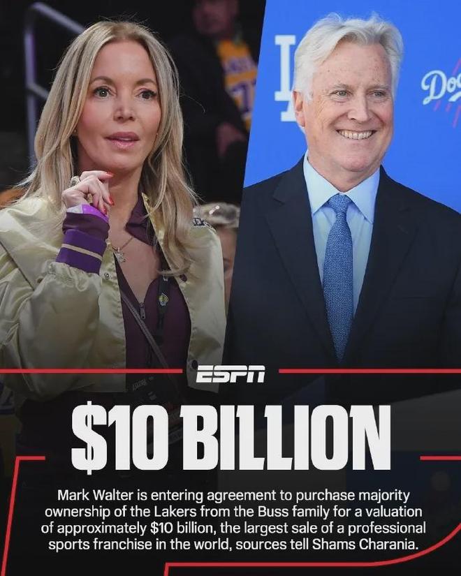 据此前爆料王Shams的报道,沃尔特收购湖人的交易估值约100亿美元,创造全球职业体育队纪录。没有看错,的确是100亿,还是美元。 值得一提的是,尽管湖人易主了,但珍妮-巴斯在接下来至少5年之内依然会担任球队的管理者。珍妮阿姨的父亲杰里-巴斯于1979年以6750万美元收购湖人,在他2013年去世后球队经营权便转给其子女,现在倒手一卖不知道翻了多少倍。