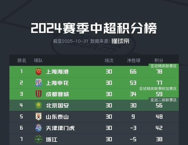 - 中超 | 随着海港30浙江,申花10,中超最新积分榜:蓉城被逆转退出争冠