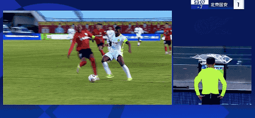 第26分钟,卡米洛正面与江文豪拼抢,径直将对方撂倒,VAR检查是否有红牌事件,最终裁判给了卡米洛黄牌。