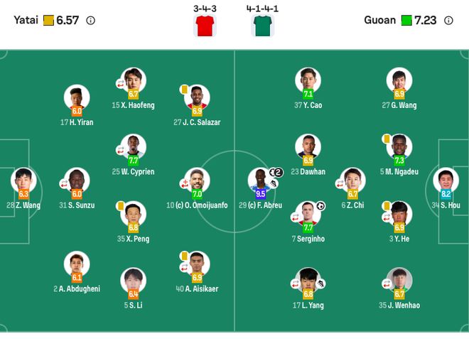 【出场阵容】长春亚泰首发:门将:28-王智峰;后卫:2-阿不都海米提-阿不都格尼、17-贺一然、31-苏祖(F)(46’6-张华晨);中场:5-李申圆、15-徐浩峰(73’20-玄智健)、25-西普里安(F)(73’36-刘国宝)、35-彭欣力;前锋:10-奥莫伊胡安弗(F)、27-卡米洛(F)、40-艾菲尔丁(46’29-谭龙);长春亚泰替补:1-安智诚、3-王耀鹏、24-严智宇、19-徐越、21-朴韬宇、37-赵英杰、7-周俊辰、11-田玉达;北京国安首发:门将:34-侯森;后卫:3-何宇鹏(64’4-李磊)、5-恩加德乌(F)、27-王刚、35-江文豪(46’26-柏杨);中场:6-池忠国(46’8-古加(F))、7-塞尔吉尼奥(64’9-张玉宁)、23-达万(F)、37-曹永竞;前锋:17-杨立瑜(77’10-张稀哲)、29-法比奥(F);北京国安替补:33-努尔艾力-阿巴斯、39-张健智、16-冯博轩、30-范双杰、21-张源、18-方昊、20-王子铭。