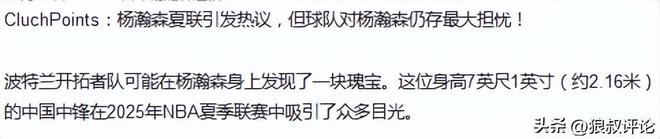 至于增重的话题,实际上杨瀚森结束了夏季联赛后,美国记者Yasmin Edañol曾报道,开拓者的运动科学团队必须为杨瀚森独特的身材量身定制一个全面的计划。这包括增加精瘦肌肉量、改善关节稳定性、以及提高骨密度(尤其是在脚、膝盖和臀部)。阻力训练、核心力量训练和增强式训练必须成为日常训练的一部分。营养和恢复方案应该达到顶级水平,确保他在安全增重的同时保持灵活性。