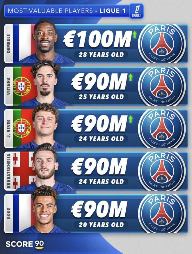 法甲Ligue1登贝莱(Ousmane Dembélé) | 法国 | 28岁 | 1.0亿欧元维蒂尼亚(Vitinha/VítorFerreira) | 葡萄牙 | 25岁 | 9000万欧元内维斯(João Neves) | 葡萄牙 | 24岁 | 9000万欧元克瓦拉茨赫利亚(Khvicha Kvaratskhelia) | 格鲁吉亚 | 24岁 | 9000万欧元杜埃(Désiré Doué) | 法国 | 20岁 | 9000万欧元