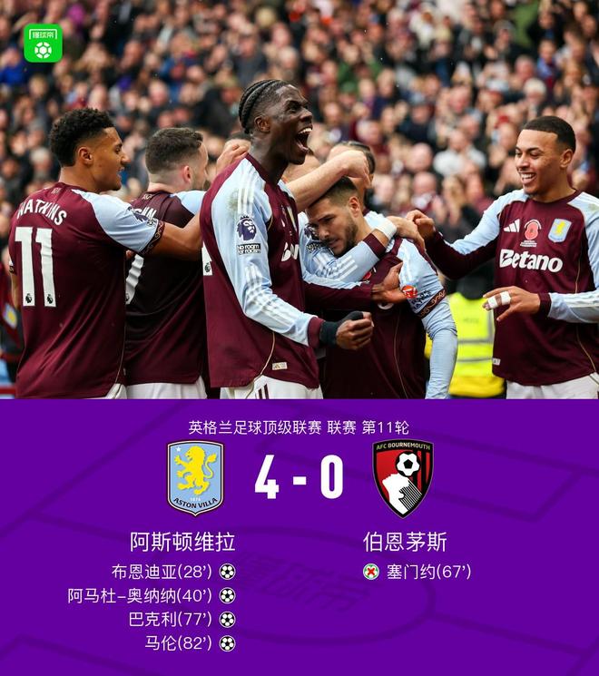 北京时间11月9日22:00,英超第11轮,阿斯顿维拉坐镇主场迎战伯恩茅斯。比赛中,布恩迪亚任意球破门,随后阿马杜-奥纳纳远射再下一城;下半场,塞门约主罚点球被大马丁扑出,巴克利、马伦先后取得进球。最终,阿斯顿维拉以4-0战胜伯恩茅斯。关键事件第28分钟,正反手教学,布恩迪亚位置相近的任意球直接破门,维拉1-0
