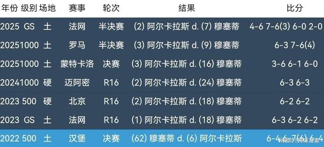 阿尔卡拉斯当然有理由兴奋,毕竟他和穆塞蒂两人职业生涯至今交锋七次,六胜一负遥遥领先。2022年ATP250乌玛格站决赛,阿尔卡拉斯三盘不敌穆塞蒂,输掉了两人职业生涯首次交锋。此后六次交锋,包括四次红土、两次硬地交锋,阿尔卡拉斯全部战胜对手,其中今年就是三次红土交锋。