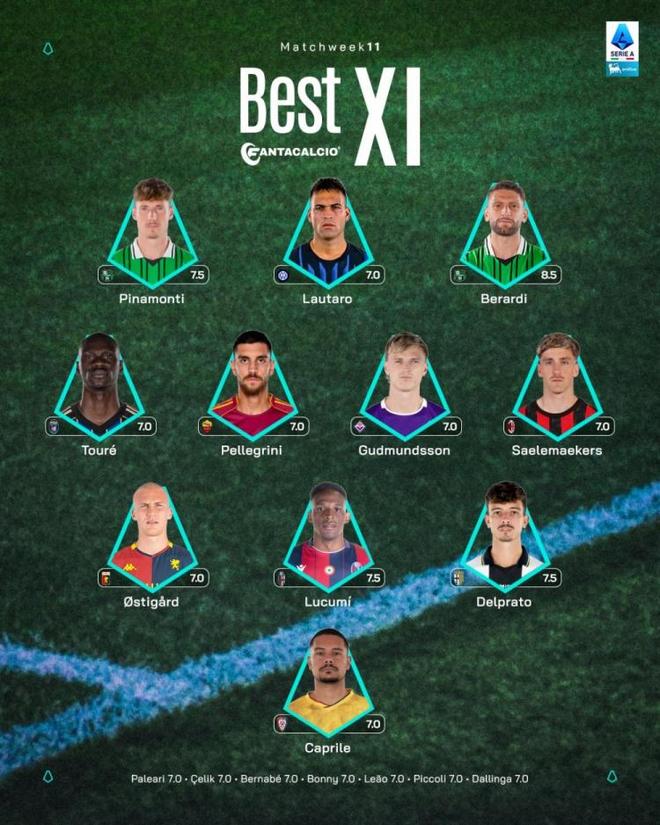 意甲官方第11轮最佳阵的:前锋:皮纳蒙蒂(萨索洛)、劳塔罗(国际米兰)、贝拉尔迪(萨索洛)中场:伊德里萨·图雷(比萨)、佩莱格里尼(罗马)、阿尔伯特·古德蒙德森(佛罗伦萨)、萨勒马科尔斯(AC米兰)后卫:厄斯蒂高(热那亚)、卢库米(博洛尼亚)、德尔·普拉托(帕尔马)门将:卡普里莱(卡利亚里)消息来源:意甲联赛官方2 - 阿莱格里称米兰是雏鸡意甲第11轮比赛,米兰在两球领先的情况被帕尔马将比分扳成2-2。本赛季,米兰出现了遇强不弱遇弱不强的问题。《米兰体育报》盘点了红黑军团的表现主帅不满。