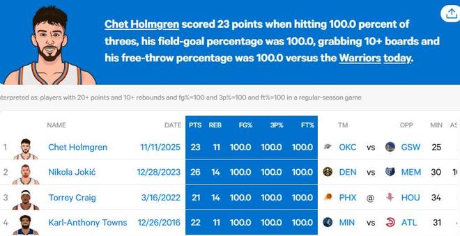 本场比赛,雷霆队内线切特-霍姆格伦出战24分39秒,9投全中砍下了23分11板2助攻1盖帽,三分2中2,罚球3中3,所有投篮命中率均为100%。据统计,切特是NBA历史上第四位在单场比赛中所有投篮命中率均为100%并得到至少20分10篮板的球员,在他之前三位球员是唐斯、克雷格和约基奇。