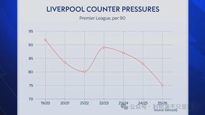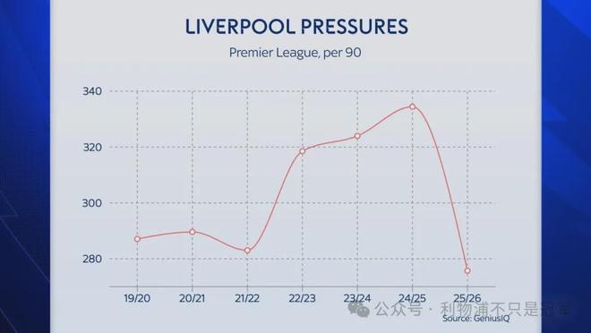 而在斯洛特时代,利物浦跑动距离的下降也是某种“有意为之”,因为斯洛特更强调控制,而不是渣叔的重金属,这在上赛季也帮助利物浦利物浦在夺冠之路上节省和积蓄了体能、减少了伤病。但是本赛季随着成绩的下滑,跑动距离的下降就要不可避免的背锅了。4、高位逼抢(Press)上赛季利物浦的逼抢次数超过此前5个赛季,但本赛季却急剧下滑到7个赛季以来的最低值。