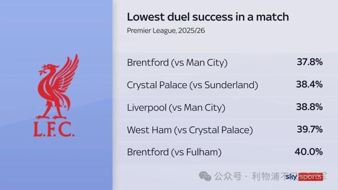 周一我们在利物浦0-3曼城的复盘中指出,利物浦几个丢球都与斯洛特遭瓜迪奥拉战术碾压有关,同时我们也特别提到,利物浦在逼抢、身体对抗的强度上,也完全被曼城压倒。技不如人、身体又拼不过,利物浦岂能不输?今天天空体育列出了一组数据,更加清晰的体现了利物浦在身体、对抗、逼抢方面的差距。别忘了,利物浦上周二打皇马,曼城上周三打多特,两队周日比赛,利物浦还比曼城多了一天备战时间。输了身体,实在不应该。1:本场利物浦只赢得了38.8%的对抗,创造了本赛季英超所有比赛第三低的对抗成功率。