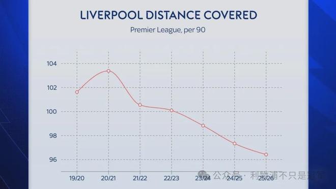 当然这里要强调,这不是斯洛特到来以后才有的趋势。统计数据表明,自2021-22赛季至今的最近5个赛季,利物浦在跑动距离方面呈现连年下降趋势,包括渣叔的最后3个赛季。