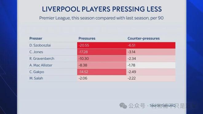 当然也应该看到,利物浦就地反抢数据的下滑,与目前英超更多球队采用长传避开利物浦反抢的战术有关,但天空体育指出,利物浦就地反抢数据的下滑,超过了英超各队的平均值。同时,要想让逼抢更有效果,需要全队协同作战,是一种集体行为,需要全队的同步和默契,而利物浦在今夏大换血之后,不但有球时组织进攻需要磨合,在无球逼抢时的同步和默契也需要重新构建,这也是一种化学反应。除了三大新援伊萨克、维尔茨和埃基蒂克这方面需要磨合提升,即便上赛季利物浦夺冠阵容中的6名中前场球员,在高位逼抢和就地反抢这两项数据也比上赛季下降。(索博斯洛伊数据的下降,与他在一些比赛中客串右后卫有关。)