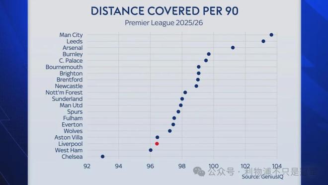 在与曼城比赛中,利物浦只有8次抢断,而曼城比利物浦的两倍还多,17次。3、跑动距离本赛季英超各队场均跑动距离,曼城高居第一,而利物浦,你可能难以置信,仅排倒数第三。