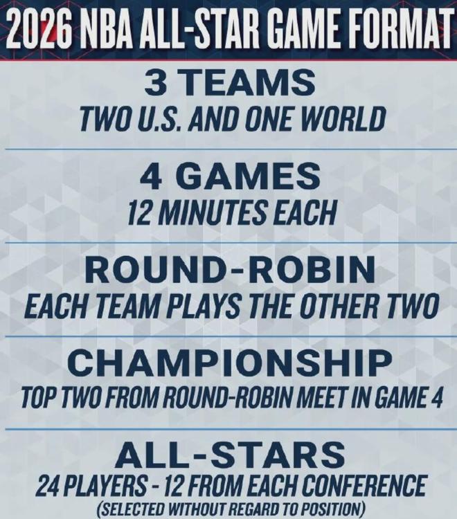 要是三队都是1胜1负,那么就砍净胜分决定晋级资格,总之就是4场对决,每场12分钟。本次全明星球员选拔也是会取消位置限制。当然,要是凑不齐8名国际球员进入全明星,那么在必要时可以选择具备其他国家背景的美国球员参赛。