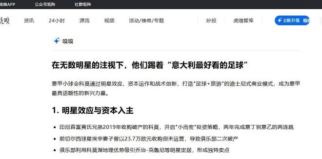 17. 如今的科莫,主场周边酒店入住率同比暴涨187%,旅游衍生品营收增长达230%,连意大利名帅萨里也不得不承认:“他们踢出了当今意大利最具观赏性的足球。”18. 从濒临解散到意甲话题中心,科莫的成长轨迹宛如一场打破常规的冒险旅程。19. 这里有老将追寻梦想的温情瞬间,有新星破茧而出的惊喜时刻,有群星云集的璀璨画面,更有资本运作与创意灵感激烈碰撞的火花。20. 或许在不远的将来,你真的能在科莫湖畔偶遇克鲁尼遛狗的身影,在观众席邂逅泰勒·斯威夫特的微笑,在球场上看见昔日偶像仍在奔跑。21. 这支被誉为“意甲迪士尼”的球队证明,足球的未来不仅关乎比分与奖杯,更在于突破疆界的无限可能。22. 信源来自:虎嗅网在无数明星的注视下,他们踢着“意大利最好看的足球”