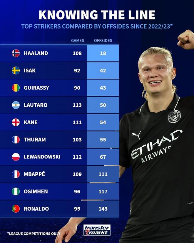 北京时间11月14日,德国转会市场盘点自2022/23赛季以来顶级前锋的越位次数。数据显示,自加盟曼城以来,哈兰德在108场比赛中,仅仅越位了18次。