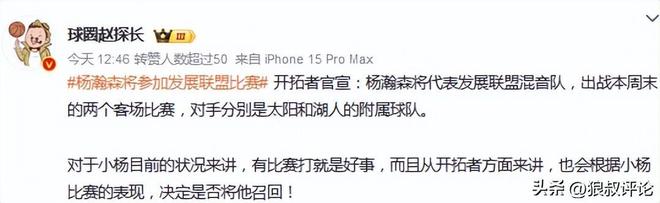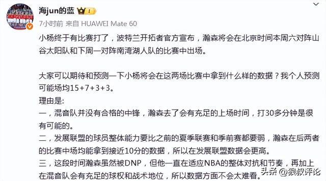 媒体人“海jun的蓝”更新社媒发文点评:“小杨终于有比赛打了,波特兰开拓者官方宣布,瀚森将会在北京时间本周六对阵山谷太阳队和下周一对阵南湾湖人队的比赛中出场。大家可以期待和预测一下小杨将会在这两场比赛中拿到什么样的数据?我个人预测可能场均15+7+3+3。