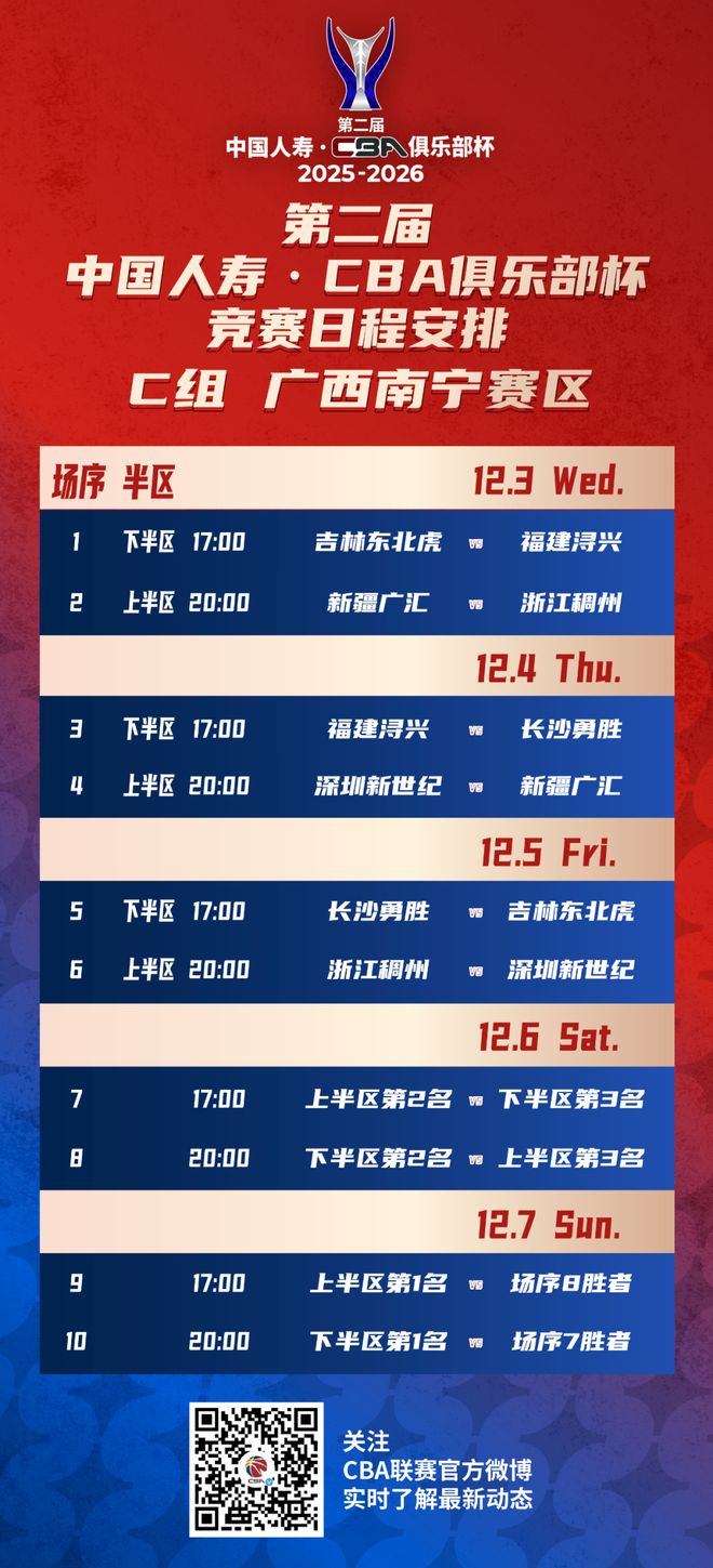 随着赛区结果揭晓, 第二届中国人寿·CBA俱乐部杯赛程也紧随其后公布。届时小组赛将于2025年12月3日-8日在湖南长沙、江西南昌、广西南宁和湖北武汉四个赛区进行。决赛阶段的比赛则将于2026年2月6日-12日在内蒙古自治区呼和浩特市进行。