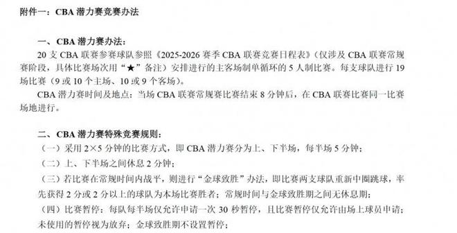如今CBA新赛季将增加CBA潜力赛,以下是官方文件具体比赛规则:一、CBA潜力赛办法:20支CBA联赛参赛球队参照《2025-2026赛季CBA联赛竞赛日程表》(仅涉及CBA联赛常规赛阶段,具体比赛场次用“★”备注)安排进行的主客场制单循环的5人制比赛。每支球队进行19场比赛(9或10个主场、10或9个客场)。CBA潜力赛时间及地点:当场CBA联赛常规赛比赛结束8分钟后,在CBA联赛比赛同一比赛场地进行。二、CBA潜力赛特殊竞赛规则:(一)采用2×5分钟的比赛方式,即CBA潜力赛分为上、下半场,每半场5分钟;(二)上、下半场之间休息2分钟;(三)若比赛在常规时间内战平,则进行“金球致胜”办法,即比赛两支球队重新中圈跳球,率先获得2分或2分以上的球队为本场比赛胜者;常规时间与金球致胜期之间无休息期;(四)比赛暂停:每队每半场仅允许申请一次30秒暂停,且比赛暂停仅允许由场上球员申请;未使用的暂停视为放弃;金球致胜期不设置暂停;1.死球期间:拥有掷球入界或罚球权队的场上队员,可用清晰的口语或规定的手势向就近的裁判员提出暂停请求,记录台宣告员在收到暂停请求后,应立即鸣笛发出信号;暂停的手势统一为:双手触肩。2.活球期间:只有控制活球的队员,可以向就近的临场裁判员用清晰的口语或单手触肩的手势提出暂停请求。(五)比赛中产生的TUD及TUD数量累计与CBA联赛不发生关联;(六)比赛装备及比赛用球:同CBA联赛要求;(七)其他竞赛规则采用中国篮协审定的最新的国际篮联《篮球规则》和《篮球规则解释》。
