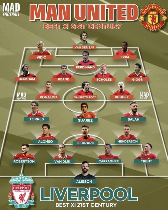 最近有媒体发布了“双红会:21世纪最佳11人”版本榜单,曼联入选有C罗、鲁尼、斯科尔斯、吉格斯、维迪奇、费迪南德、范德萨等;利物浦方面则是萨拉赫、苏亚雷斯、托雷斯、杰拉德、阿隆索、范戴克、阿利松等。争议点不少:其一,按“仅看21世纪表现”计算,贝克汉姆是否该入选?其二,利物浦锋线要不要用马内替托雷斯?支持与反对的数据都能举出来,这份名单注定要吵一阵。曼联最强阵容C罗(Cristiano Ronaldo)国籍:葡萄牙效力:2003–2009 | 18–24岁;2021–2022| 36–37岁随队冠军:英超3、足总杯1、欧冠1、联赛杯2范尼(Ruud van Nistelrooy)国籍:荷兰效力:2001–2006 | 25–30岁随队冠军:英超1、足总杯1、联赛杯1鲁尼(Wayne Rooney)国籍:英格兰效力:2004–2017|18–31岁随队冠军:英超5、足总杯1、欧冠1、欧联杯1、联赛杯4