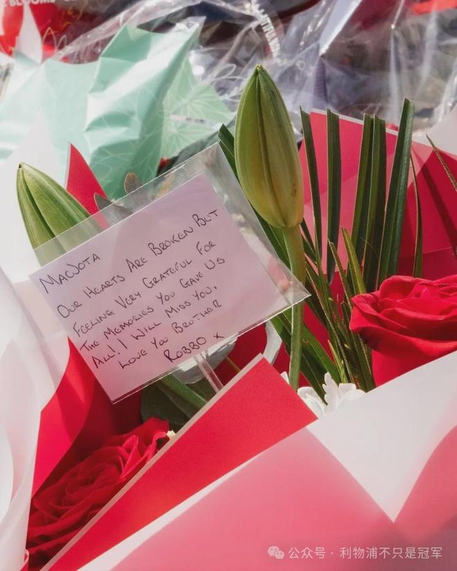我在网络上搜索着罗伯逊和若塔的图片,除了那一张张拥抱和欢笑的照片,还有一张卡片,那是罗伯逊在七月份在安菲尔德球场外悼念若塔、敬献鲜花时,写给若塔的卡片:“MacJota:我们的心都碎了。但是,我们都非常感激你带给我们的美好回忆。我会想念你!爱你,兄弟!”