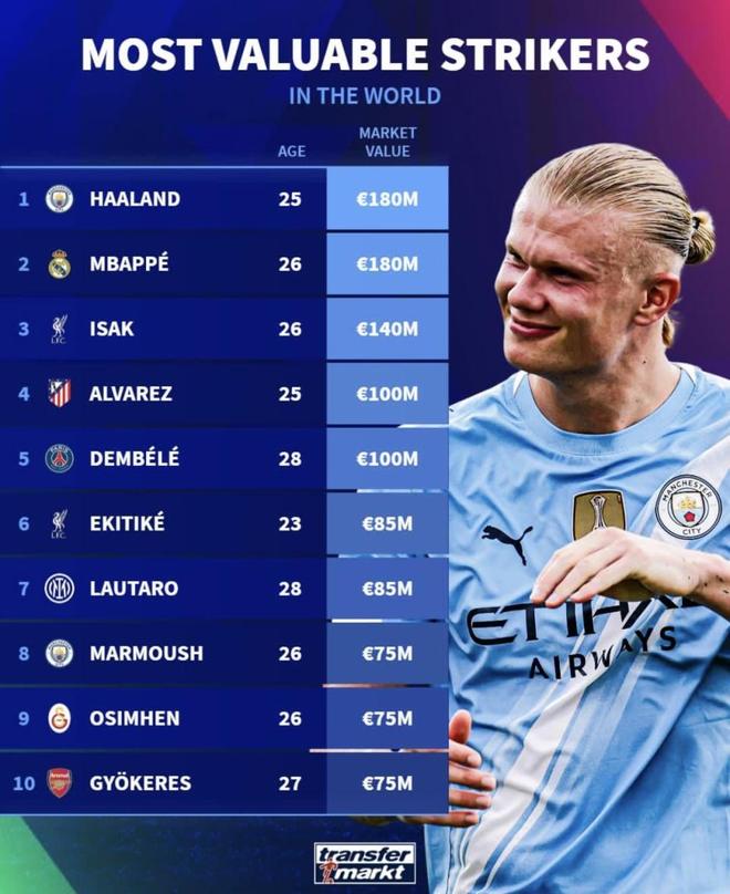 劳塔罗(Lautaro Martínez)国籍:阿根廷俱乐部:国际米兰年龄:28身价:8500万欧元马尔穆什(Omar Marmoush)国籍:埃及俱乐部:曼城年龄:26身价:7500万欧元奥斯梅恩(Victor Osimhen)国籍:尼日利亚俱乐部:加拉塔萨雷年龄:26身价:7500万欧元约克雷斯(Viktor Gyökeres)国籍:瑞典俱乐部:阿森纳年龄:27身价:7500万欧元