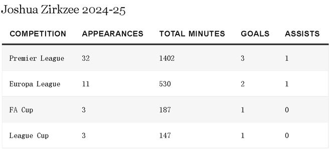 齐尔克泽的问题,除了进球能力不佳之外,还有一系列的伤病。他因为大腿受伤缺席上赛季末的6场英超,欧联杯决赛虽然复出,可惜替补出场20分钟难以挽回败局,他不是谢林汉姆或者索尔斯克亚。季前赛的受伤,让齐尔克泽缺席美国之旅和赛季初的比赛,他在曼联锋线上的排名也逐步后退。343只需要3名前锋,而阿莫林的选择有库尼亚、姆贝莫、谢什科、梅森·芒特和阿马德·迪亚洛,齐尔克泽至少排在第6位,比在荷兰队还靠后。在齐尔克泽的最佳状态下,他可以举重若轻地持球,并带动队友。这种打法让他在意甲赢得了赞誉,但英格兰球迷更欣赏那些充满侵略性,在场上搏命的球员,如杰米·瓦尔迪。谢什科的膝伤,以及姆贝莫和阿马德参加非洲国家杯,可能为齐尔克泽重新提供一个正名的舞台,尤其是下轮的对手埃弗顿,是英超被齐尔克泽破门最多的球队!